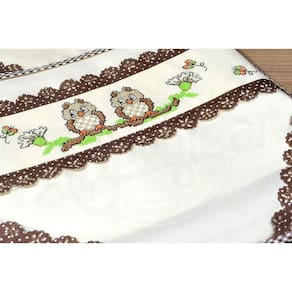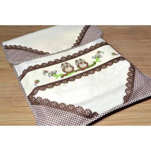 Capa confeccionado em tecido tergal palha, com barrado bordado em ponto cruz com duas simpáticas corujinhas nas cores marrom, verde e bege, com acabamentos em laise com poás e viés xadrez marrom.