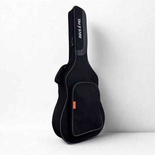 A Capa Para Violão Acolchoada Deus é Fiel Preta Voik BG41-060 é a escolha ideal para quem busca proteção superior, praticidade e estilo ao transportar seu instrumento. Com um acolchoamento robusto de 1,3 cm, ela protege seu violão de arranhões, impactos e batidas, enquanto a resistência à água garante segurança mesmo em situações de garoa ou umidade. O transporte é extremamente confortável graças às alças de ombro duplas ajustáveis, no estilo mochila, além de uma alça de mão que facilita o manuseio em diferentes ocasiões. Os bolsos externos com zíper oferecem espaço extra para armazenar acessórios essenciais como palhetas, afinadores e cordas, mantendo tudo organizado e acessível. A estampa exclusiva "Deus é Fiel" adiciona um toque de personalidade e fé, transformando a capa em um item único e expressivo. Compatível com violões que variam entre 38 cm e 42 cm de largura e de 100 cm a 107 cm de comprimento, ela se adapta facilmente a diversos modelos. Diferenciando-se de capas comuns, a Voik BG41-060 oferece acolchoamento espesso, resistência à água, alças ergonômicas e uma estampa exclusiva, tudo isso com excelente custo-benefício para quem não abre mão de segurança e estilo.