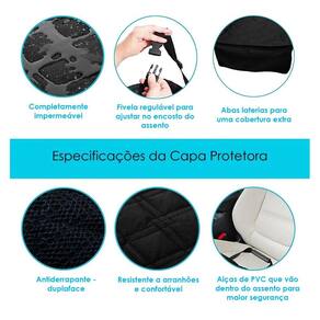 Instala-se de forma rápida e fácil, possui fixação auto aderente no cinto de segurança e um tubo para fixar a capa ao assento.