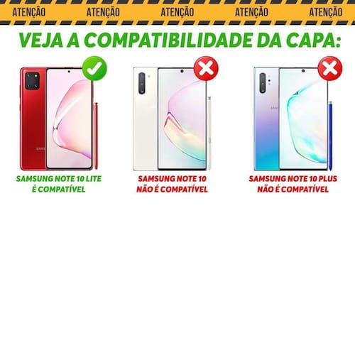 Compatível apenas com o Samsung Galaxy Note 10 Lite, essa capa não serve em outras versões do smartphone.