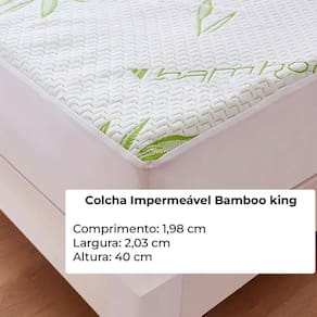Protetor De colchão King Bamboo ImpermeávelVocê sabia que passamos cerca de um terço de nossas vidas dormindo Uma boa noite de sono é essencial para o nosso bem-estar físico e mental. E para garantir que suas noites sejam de total conforto e higiene, apresentamos o Protetor de Colchão Impermeável Bamboo King CamesaMedidas:Larg: 1,98cmCompr: 2,03cmAltu: 40 cmPeso: 1,430kgDurabilidade e proteção incomparáveis:O Protetor de Colchão Impermeável Bamboo King Camesa é confeccionado com materiais de alta qualidade, garantindo durabilidade e resistência ao longo do tempo. Com sua camada impermeável, você protegerá seu colchão contra líquidos, manchas, ácaros e odores indesejáveis. Sua superfície em tecido de bambu é macia ao toque e proporciona uma sensação agradável durante o sono.Ajuste perfeito e facilidade de uso:Com dimensões ideais para colchões king-size, o Protetor de Colchão Impermeável Bamboo King Camesa se adapta perfeitamente ao seu colchão, garantindo uma cobertura completa e segura. Seu elástico em toda a volta proporciona uma instalação rápida e fácil, evitando que o protetor se desloque durante a noite.Higiene para sua saúde e bem-estar:A saúde é nosso bem mais precioso, e a higiene do nosso ambiente de descanso é essencial para uma vida saudável. O protetor de colchão é uma barreira eficaz contra ácaros, bactérias e fungos, responsáveis por alergias e problemas respiratórios. Com o Protetor de Colchão Impermeável Bamboo King Camesa, você garante um sono tranquilo e seguro, protegendo sua saúde e a de toda a sua família.Fácil manutenção:A limpeza do Protetor de Colchão Impermeável Bamboo King Camesa é muito simples. Basta remover o protetor do colchão e lavá-lo na máquina, seguindo as instruções do fabricante. Dessa forma, você terá sempre um ambiente limpo e saudável para o seu descanso.Proteja seu investimento:Investir em um colchão de qualidade é importante, e o Protetor de Colchão Impermeável Bamboo King Camesa ajuda você a prolongar a vida útil do seu colchão, evitando danos que poderiam reduzir sua durabilidade. Com essa proteção extra, você economiza a longo prazo, garantindo o melhor retorno para o seu investimento.Não perca mais tempo Cuide do seu sono, da sua saúde e do seu colchão com o Protetor de Colchão Impermeável Bamboo King Camesa