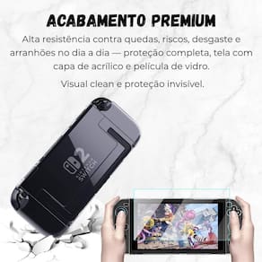 Capa protetora + película de vidro para nintendo switch 2 Cor: transparente proteja seu novo nintendo switch 2 com estilo e segurança com a case protetora de acrílico, especialmente projetada para oferecer máxima proteção sem comprometer o design elegante do seu console. adquira a case protetora de acrílico para o novo nintendo switch 2 e garanta uma experiência de jogo sem preocupações, onde quer que você esteja. ------------------ ------------------ como é a instalação da case protetora de acrílico R: basta encaixar a case e pronto, uma aplicação simples e segura é fácil de colocar e remover. posso utilizar a case junto com a película de vidro R: sim, ambos podem serem utilizadas juntos. a case interfere nas funcionalidades do nintendo switch 2, como o acesso aos botões e portas R: não, a case foi projetada com precisão para garantir acesso completo a todos os botões, portas e funcionalidades do console. essa case é compatível com outras versões do nintendo switch R: não. Esta case é projetada exclusivamente para o novo nintendo switch 2 a case escorrega nas mãos R: não mesmo sendo de acrílico liso, possui pegada firme e confortável, que acompanha o formato das mãos, oferecendo conforto mesmo em longas sessões de jogo. ------------------ Especificações ------------------ Material: acrílico transparente de alta qualidade Design: leve e ergonômico Proteção: resistente a impactos e arranhões Compatibilidade: exclusivamente para o novo nintendo switch 2 ------------------ Conteúdo ------------------ 1x case para nintendo switch 2. 1x película de vidro. 1x kit limpeza. Anúncio referente a case protetora. Acessórios que ambientam as fotos não inclusos. ------------------ Apresentação: ------------------ - qualidade garantida. - atendimento qualificado. - enviamos para todo o brasil. - compra garantida. - despachamos em até 1 dia útil após confirmação do pagamento Garantimos a devolução por arrependimento em até 7 dias, após o recebimento e de 15 dias contra defeitos de fabricação.