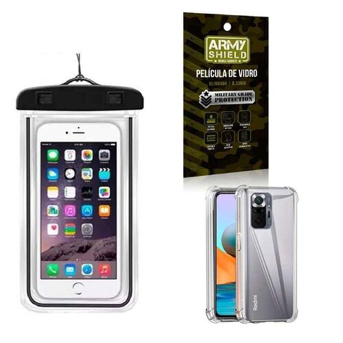 Utilize seu celular em qualquer lugar sem medo de molhar ou danificar o mesmo. Tire fotos, grave vídeos e utilize o touch normalmente, sabendo que seu aparelho está protegido contra água e sujeira dentro da bolsa. Tudo isso, contando com a praticidade de poder utilizar a capinha com cordão para pescoço.Características:- compatível com todos os celulares de até 7.2 polegadas.- cordão para pendurar no pescoço.- impermeável.- preservada a sensibilidade do touch.Obs: a qualidade das fotos dependerá da qualidade de sua câmera, iluminação, dentre outros fatores, uma vez que o material da bolsa é transparente e não influência na mesma.Teste a ser feito antes de utilizar o acessório:- coloque um pedaço de papel dentro da bolsa e feche a mesma.- mergulhe em uma bacia com água e espere de 5 a 10 minutos.- retire o papel, esse tem que estar seco. Não nos responsabilizamos pelo uso incorreto da bolsa. Compatibilidade:Para aparelhos de até 7 polegadas.Tamanho máximo comportado: altura - 18cm / largura - 10cm.Conteúdo da embalagem:1x - capinha bolsa prova d'água para celular impermeável.1x - cordão para pescoço.--------------Película de vidro 3d blindada - armyshieldA película de vidro 3d para celular é um produto de alta qualidade que oferece proteção e estilo para o seu dispositivo móvel. Feita de vidro temperado de alta resistência, a película é projetada para se encaixar perfeitamente na tela do seu celular, proporcionando uma cobertura completa e proteção contra arranhões, rachaduras e outros danos.--------------Capinha silicone anti impacto anti shock transparente - armyshieldA capa de celular antishock é um produto de alta qualidade que oferece proteção e estilo para o seu dispositivo móvel. Feita de material de tpu poliuretano termoplástico de alta resistência, a capa é projetada para absorver impactos e proteger o seu celular contra quedas, arranhões e outros danos.A capa antishock transparente é especialmente projetada para se encaixar perfeitamente no seu celular, proporcionando uma cobertura completa e proteção para todas as partes do dispositivo. Ela é transparente, permitindo que você exiba a beleza do seu celular sem comprometer a proteção.