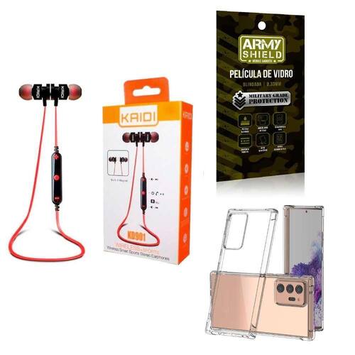 Fone de Ouvido Esportivo sem fio KD-901Se você procura um fone para as atividades diárias, exercícios e movimento o fone sem fio KD-901 é a escolha idealContém Tons graves , profundos e complexos. Um verdadeiro som de qualidadeControle a reprodução de músicas e vídeos direto do botão de controle.Atenda e desligue chamadas, microfone HD in line embutido com controle de faixas.Com imã embutido que não atrapalha e não fica caindo da orelha, produto de design intra-auricular projetado para ser confortável ao ouvido. Isolamento de ruídos sem vazamento de som. O fone utiliza uma tecnologia aeronáutica de redução de ruído. Isola interferência de ruído externo. Mergulhe no mundo da músicaEspecificaçãoVersão: V4.2Tempo de espera: 200hTempo de conversação: 6hTempo de reprodução de música: 4hTempo de carregamento: 1.5hFaixa de frequência: 2.402G-2.480GTemperatura ambiente: -20/ +60CDistância de transmissão: 10mEspecificação do DriverUnidade do driver: 10mmSensibilidade: 103dB +-3dBImpedância: 16 +- 15%Resposta de frequência: 20-20000HzComprimento do cabo: 600mm Conteúdo da Embalagem:1und - Fone de Ouvido Esportivo sem fio com microfone HD Atenção: Não acompanha itens não descritos neste anúncio.-------------Capinha Silicone Anti Impacto Anti Shock Transparente - ArmyshieldA capa de celular antishock é um produto de alta qualidade que oferece proteção e estilo para o seu dispositivo móvel. Feita de material de TPU poliuretano termoplástico de alta resistência, a capa é projetada para absorver impactos e proteger o seu celular contra quedas, arranhões e outros danos.A capa antishock transparente é especialmente projetada para se encaixar perfeitamente no seu celular, proporcionando uma cobertura completa e proteção para todas as partes do dispositivo. Ela é transparente, permitindo que você exiba a beleza do seu celular sem comprometer a proteção.-------------Película de Vidro 3D Blindada - ArmyshieldA película de vidro 3D para celular é um produto de alta qualidade que oferece proteção e estilo para o seu dispositivo móvel. Feita de vidro temperado de alta resistência, a película é projetada para se encaixar perfeitamente na tela do seu celular, proporcionando uma cobertura completa e proteção contra arranhões, rachaduras e outros danos.A película de vidro 3D é especialmente projetada para se curvar suavemente ao redor das bordas do seu celular, criando uma aparência elegante e sem bordas. Isso significa que você pode desfrutar de uma experiência de visualização imersiva e sem interrupções, sem se preocupar com a película descolando ou interferindo na sensibilidade da tela.Atenção: O produto acompanha apenas o que apresenta na imagem.