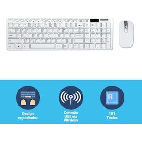 Capa silicone inclusa: kit teclado e mouse sem fio wireless 2. 4ghz 1000dpi com capa silicone o kit teclado e mouse wireless sem fio ultra slim 2. 4g é perfeito para quem busca praticidade e conforto durante o uso do computador. Com design ultra slim e cores elegantes, cor branca e o cor preta combinam perfeitamente com qualquer ambiente. O teclado possui layout em português brasil, facilitando a digitação e garantindo uma experiência mais fluída. Além disso, o mouse possui sensor óptico de 400 dpi, proporciondo precisão nos movimentos. Ambos os dispositivos são sem fio, o que elimina a necessidade de fios e permite maior liberdade de movimento. A conexão é feita através de um usb 2. 4g, que garante uma conexão estável e sem interferências. Dimensões e peso: teclado profundidade: 12,3 cm altura: 3,4 cm largura: 43,3 cm peso: 400 g
