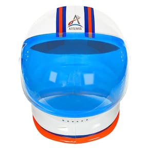 - Este capacete é uma adição obrigatória a uma fantasia de astronauta e também é ótimo para missões lunares de fingir que estão brincando. Possui uma viseira retrátil e adesivos da NASA e Artemis.