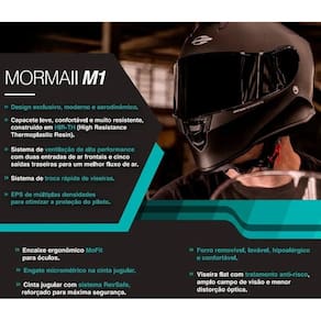 SOBRE O PRODUTOO PRODUTO ACOMPANHA O CAPACETE M1 PRETO FOSCO COM VISEIRA CRISTAL + VISEIRA FUMÊOBS.: CASO DESEJE SUBSTITUIR A VISEIRA FUMÊ PELA VISEIRA ESPELHADA OU CAMALEÃO MANDE-NOS UMA MENSAGEM IMEDIATAMENTE APÓS A COMPRA E ANTES DO DESPACHO DO PRODUTO.O novo capacete MORMAII M1 foi projetado e desenvolvido dentro de padrões internacionais de segurança e desempenho. Seu casco é construído em material muito leve e resistente, com design moderno e aerodinâmico. A união de performance, segurança e conforto tornam o M1 um produto diferenciado, que irá combinar com seu estilo.ESPECIFICAÇÕES DO PRODUTODIVISÃOADULTOGÊNEROUNISSEXCARACTERÍSTICA- Capacete construído em hir-th (high resistance thermoplastic resin), tornando-o leve e com alta resistência a impactos- Casco exclusivo com design moderno e aerodinâmico- Sistema de ventilação de alta performance, com duas entradas de ar frontais e cinco saídas traseiras, melhorando o fluxo de ar- Eps de múltiplas densidades para otimizar a proteção do piloto- Sistema de retenção reforçado para máxima segurança- Engate micrométrico na cinta jugular- Forro removível, lavável, hipoalérgico e confortável- Encaixe ergonômico para óculos- Viseira flat 2mm com tratamento anti-risco, amplo campo de visão e menor distorção óptica- Sistema de troca rápido de viseirasProduto NOVO na CAIXA ORIGINAL Importado.