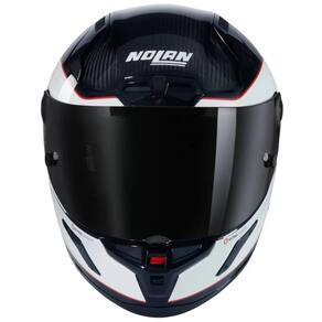 Com um design que simboliza resolutividade e espírito combatente, o acabamento Asso Di Picche se destaca. A textura da fibra de carbono alterna com o contraste preto e branco da pintura em brilho, e um contorno refinado na viseira ultrawide realça o dinamismo. Detalhes como a sutil bandeira italiana celebram a produção 100% Made in Italy da Nolan.