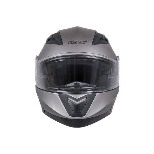 Capacete Texx Escamot Gladiator V3 Chumbo Fosco 60 [f016] CAPACETE TEXX ESCAMOT GLADIATOR V3 CHUMBO FOSCO 60 Com frente escamoteável. o capacete TEXX Gladiator V3 possui as viseiras externa e solar interna com acabamento antirrisco. antiembaçamento e com proteção UVA/UVB. O forro interno é produzido com moléculas de prata antifungo e antibactéria.