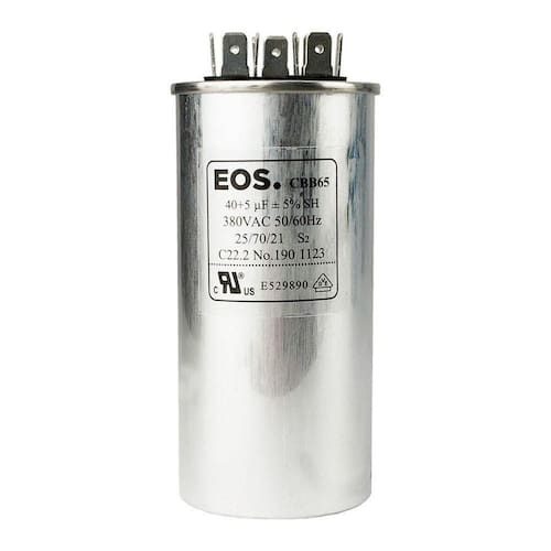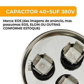 Capacitor 40 + 5 f 380v Capacitor 40 + 5uf 380v CBB65, D29003 Capacitor 40 + 5uf 380v Marca: EOS (das imagens do anúncio, mas possuímos VIX, ELGIN OU OUTRAS CONFORME ESTOQUE)
