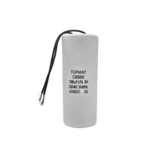- Modelo: CBB60 - Capacitância: 100uF - Tolerância: 5% - Tensão nominal: 250V AC - Frequência: 50/60Hz - Fios: 2 terminais com isolação - Temperatura de operação: - 40 graus a +85 graus - Aplicações: Motores elétricos, ventiladores e compressores. Marca: Não Informado