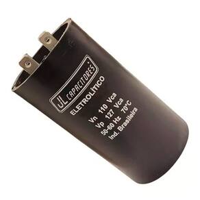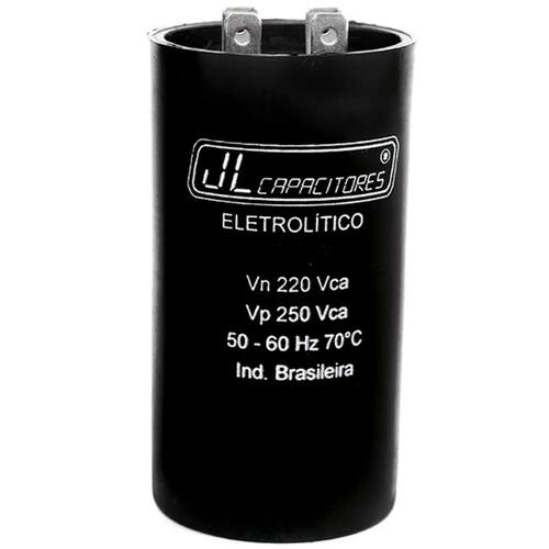 Marca: JL Capacitores Modelo: Eletrolítico Cor: Preto Frequência: 50/60Hz Conector: Tipo Terminal, Duplo ou Simples Capacitância: 430-516UF Voltagem máxima: 127 volts Temperatura mínima de operação: 0° Temperatura máxima de operação: 70°