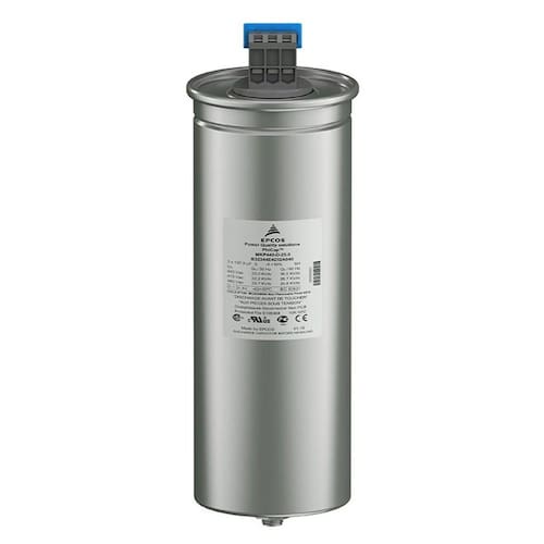 Características Gerais do Produto: • Ligação: Trifásico, Delta Conectado • Normas de Referência: IEC 60831–1/2, UL 810-5 • Corrente de Curto Circuito: 10kA • Tecnologia: Auto-regeneração • Refrigeração: Natural ou forçada • Aplicação: Correção do Fator de Potência • Grau de Proteção: IP20 • Isolamento: Filme de Polipropileno • Impregnação: Resina Biodegradável Semi-Seca, sem PCB • Caneca: Alumínio Extrudado com Pino • Descarga: Módulo de Descarga de Cerâmica • Sistema de Segurança: Triplo Sistema de Segurança • Segurança Mecânica: Desconector de Sobrepressão • Montagem: Interna, na Vertical com os Terminais para Cima • Fixação e Aterramento: Parafuso Rosqueado M12 • Máximo Torque de Fixação: 10 Nm • Tempo de Descarga do Resistor: = 60s para 50V ou menos • Vida Útil: Acima 135.000 Horas (temperatura classe C); Acima 100.000 Horas (temperatura classe D) • Máximo Ligações: 5000 por ano • Marca: EPCOS / TDK