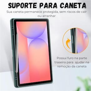 Capa de silicone com slot para caneta e traseira de acrílico que não amarela. Inclui película de vidro e kit de limpeza.Tipo