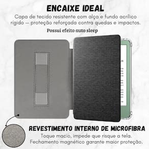 Capa com alça lateral para segurar o Kindle com firmeza e conforto, função auto sleep/wake que liga e desliga o aparelho automaticamente ao abrir e fechar a capa, fechamento magnético para segurança, fundo de acrílico transparente resistente ao amarelamento e revestimento interno em microfibra para evitar riscos na tela.Tipo