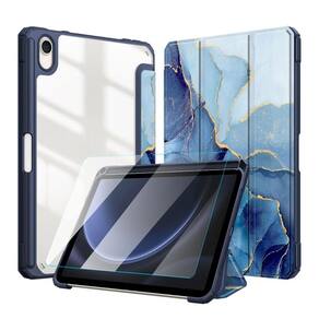 Capa com estampa mármore, suporte para caneta, traseira de acrílico que não amarela, material interno de camurça e externo de silicone. Inclui película de vidro e kit de limpeza.Tipo