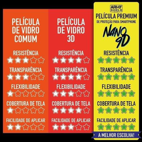 Kit película nano 9d armyshield + capa anti impacto é a mais moderna tecnologia para proteção de telas de smartphones. Seu material é leve flexível e resistente, algumas pessoas chamam de nano cerâmica. A película nano 9d é extremamente fácil a aplicação, sendo sua cola estática mais precisa, não deixando bolhas em a utilização de cola ou adesivos. Pode ser removida sem danificar o equipamento. Extremamente resistente à riscos e batidas. A película nano 9d armyshield, não trinca com o uso. Diferente das películas 3d, 4d, 6d que ao sofrer impacto podem trincar, sendo assim necessária a troca da película. Ou seja, a nano 9d armyshield é proteção por muito mais tempo. A nano tecnologia permite que a película recupere pequenos arranhões que sofra com o tempo. Além de proteger toda a tela, cobrindo 100% da tela e bordas. A película nano 9d permite que celulares com digital na tela não percam sua função, pois ela não atrapalha o uso. Do que é feito a película nano 9d o nome correto do material é álcali-aluminossilicato que foi projetado para ser fino, leve e especialmente resistente a danos e riscos. Porque escolher a nano 9d armyshield - não trinca com o uso, como as películas comuns e 3d de vidro. - tecnologia única com camada nano que permite maior absorção de impacto. - cobre 100% da tela e bordas - fácil aplicação, não deixando bolhas. - blue filter - reduz a fadiga e cansaço visual. Essa película reduz a sensibilidade do touch não, ela mantém a sensibilidade. E mantem a tela limpa por mais tempo impedindo o contato oleoso dos dedos. Capa anti impacto armyshield para você que procura uma capinha resistente para o seu smartphone temos a capa anti impacto armyshield. Ela possui cantos reforçados que permite uma ótima absorção de impacto no caso de quedas. Ela também possui um design fino e leve. Por ser transparente a beleza do seu aparelho não é afetada. Ela permite também que você desfrute também de todas as funções do seu smartphone, pois possui os furos e recortes necessários para o seu aparelho. Produzida em silicone transparente. Itens inclusos: - 1 película nano 9d armyshield - 1 lenço umedecido profissional para lentes e telas - capa anti impacto compatível