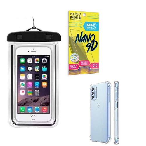 Capinha de celular a prova dágua Utilize seu celular em qualquer lugar sem medo de molhar ou danificar o mesmo. Tire fotos, grave vídeos e utilize o touch normalmente, sabendo que seu aparelho está protegido contra água e sujeira dentro da bolsa. Tudo isso, contando com a praticidade de poder utilizar a capinha com cordão para pescoço.Características:- compatível com todos os celulares de até 7.2 polegadas.- cordão para pendurar no pescoço.- impermeável.- preservada a sensibilidade do touch.Obs: a qualidade das fotos dependerá da qualidade de sua câmera, iluminação, dentre outros fatores, uma vez que o material da bolsa é transparente e não influência na mesma.Teste a ser feito antes de utilizar o acessório:- coloque um pedaço de papel dentro da bolsa e feche a mesma.- mergulhe em uma bacia com água e espere de 5 a 10 minutos.- retire o papel, esse tem que estar seco. Não nos responsabilizamos pelo uso incorreto da bolsa. Compatibilidade:Para aparelhos de até 7 polegadas.Tamanho máximo comportado: altura - 18cm / largura - 10cm.Conteúdo da embalagem:1x - capinha bolsa prova d'água para celular impermeável.1x - cordão para pescoço.--------------Película nano cerâmica 9d com kit instalaçãoPelícula nano cerâmica 9d com bordas pretas cobre 100% da tela - película flexível não trinca com o uso e nem quebra - fácil aplicação - proteção avançada contra riscos e quedas - dura até 5x mais que as películas de vidro Alguns modelos de películas possuem um leve recuo para que a mesma não saia com o uso da capinha Somos especialistas em acessórios para celular há mais de 7 anos Antes de comprar verifique se o modelo do seu celular é o mesmo do produto comprado. Agradecemos a preferência--------------Capinha silicone anti impacto anti shock transparente - armyshieldA capa de celular antishock é um produto de alta qualidade que oferece proteção e estilo para o seu dispositivo móvel. Feita de material de tpu poliuretano termoplástico de alta resistência, a capa é projetada para absorver impactos e proteger o seu celular contra quedas, arranhões e outros danos.A capa antishock transparente é especialmente projetada para se encaixar perfeitamente no seu celular, proporcionando uma cobertura completa e proteção para todas as partes do dispositivo. Ela é transparente, permitindo que você exiba a beleza do seu celular sem comprometer a proteção.