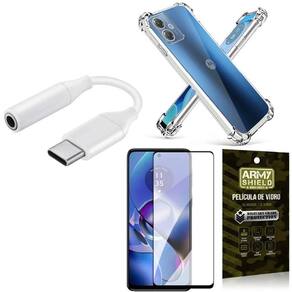 Kit adaptador para fone de ouvido + Capinha Antishock Transparente + Película de Vidro 3D Blindada