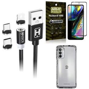 Kit Capinha Silicone Transparente anti shock com bordas reforçadas + Película de Vidro 3D Blindada ArmyShield + Cabo Magnetico de 2 metros com 3 pontas.