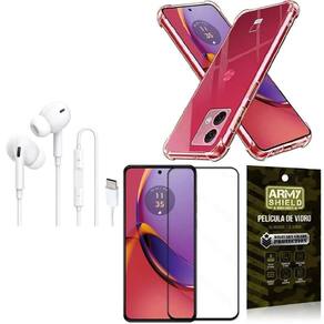 Kit Capinha AntiShock Transparente + Película de Vidro 3D + Fone de ouvido Tipo C Intra-Auricular estéreo com microfone