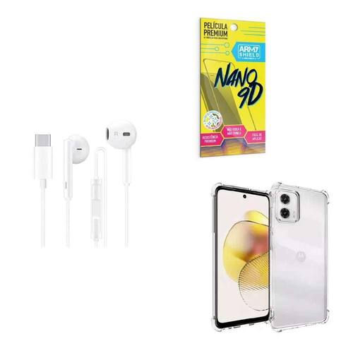 Kit Capinha Moto G73 AntiShock Transparente + Fone de Ouvido Tipo C Estéreo - EJ-105 + Película de Cerâmica 9D Frontal