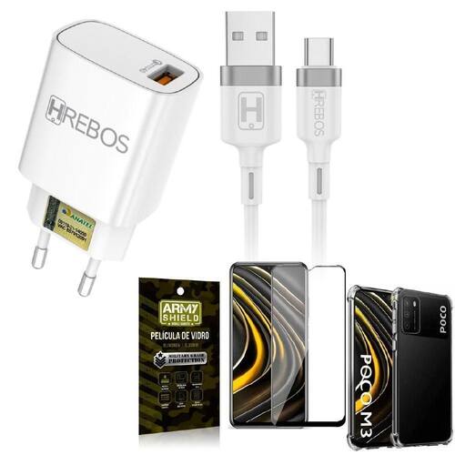 Carregador turbo 3. 0 hs183 tipo c + capinha anti impacto + película 3d - armyshield