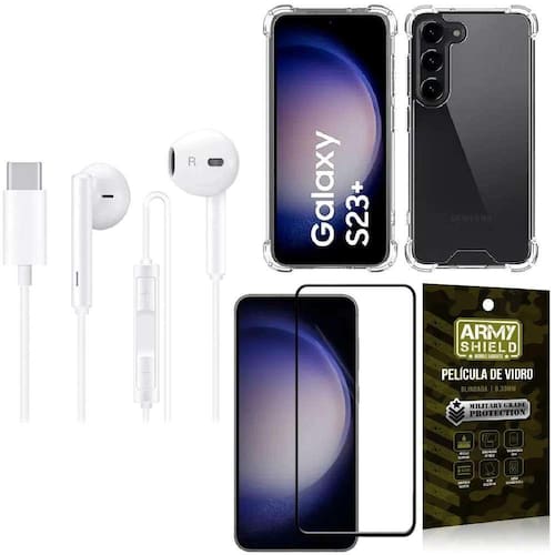 Kit Capinha AntiShock Transparente + Película de Vidro 3D + Fone de ouvido Tipo C estéreo com microfone