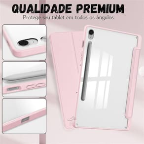 A capa possui um design funcional, com um slot para caneta que permite fácil acesso e armazenamento da sua caneta. Além disso, a textura de silicone na parte externa proporciona uma aderência confortável e segura, evitando que o tablet escorregue enquanto você o segura ou carrega. A parte traseira de acrílico também contribui para a proteção, mantendo a aparência elegante do seu dispositivo por mais tempo, sem amarelar com o tempo.