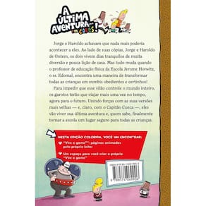 Acompanhe Jorge e Haroldo — do passado, presente e futuro — na última e mais importante aventura do Capitão Cueca! Jorge e Haroldo achavam que nada mais poderia acontecer a eles. Ao lado de suas cópias, Jorge e Haroldo de ontem, os dois vivem dias tranquilos de muita diversão e pouca lição de casa. Mas tudo muda quando o professor de educação física da escola Jerome Horwitz, o sr. Edomal, encontra uma maneira de transformar todas as crianças em zumbis obedientes e certinhos! Para impedir que este vilão controle o mundo inteiro, os garotos terão que viajar mais uma vez no tempo, agora com destino ao futuro. Unindo forças com as suas versões mais velhas, Jorge e Haroldo — além, é claro, do Capitão Cueca — se preparam para viver sua última aventura e, quem sabe, finalmente tornar a escola um lugar seguro para todas as crianças. Indicado para leitores a partir de 6 anos.