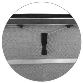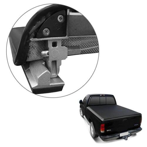 Estrutura e travas fabricadas em alumínio injetado com encaixe trek, sendo o material já conhecido pela excelente qualidade e resistência, com debrum de lona em Trama de 6x6 e tensores destacáveis para uma maior praticidade em seu manuseio, além de possuir puxador para facilitar a abertura da capota.