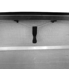 Estrutura e sistema de travas fabricadas em alumínio injetado com encaixe trek, acompanha varetas transversais, mantendo a lona esticada para que não haja acúmulo de água, acabamento debrum de lona em trama de 8x8 e tensores destacáveis para maior praticidade em seu manuseio, além de possuir puxador para facilitar a abertura da capota.