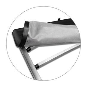 Estrutura e sistema de travas fabricadas em alumínio injetado com encaixe trek, acompanha varetas transversais, mantendo a lona esticada para que não haja acúmulo de água, acabamento debrum de lona em trama de 8x8 e tensores destacáveis para maior praticidade em seu manuseio, além de possuir puxador para facilitar a abertura da capota.