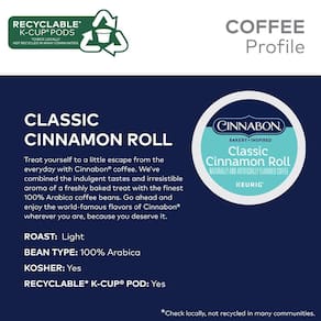Começamos com uma cerveja suave e levemente assada e giramos nos sabores decadentes de Canela Cinnabon, Açúcar Mascavo e, claro, nossa cobertura lendária. Tome um gole e delicie-se com o sabor dos nossos mundialmente famosos rolos de canela, quentes do forno. É uma xícara de perfeição deliciosa. Rolo de Canela Clássico Cinnabon O rolo. O mito. A lenda. Esse sabor superior e aroma inconfundível e de longo alcance vem da Canela Makara, que se origina nas montanhas de Sumatra Ocidental, na Indonésia. Combinado com nossa massa macia e macia e cobertura de assinatura fofa, este não é o seu rolo de canela comum. Rolo de Canela Clássico CinnabonRedemoinho com canela, canela, açúcar mascavo e cobertura Uma xícara de perfeição deliciosa Torrado leve, café com cafeína Café Cinnabon Caramel Pecan O café Cinnabon tem um sabor que vai fazer você voltar para mais. Em cada gota, você pode provar a qualidade superior dos grãos de café Arábica, o que dá ao nosso café um sabor notavelmente equilibrado. Combinamos o sabor indulgente e o aroma irresistível dos rolinhos de canela Cinnabon com os melhores grãos de café 100% Arábica em uma xícara de deliciosa perfeição. Marca: Não Informado Ean: 611247373156