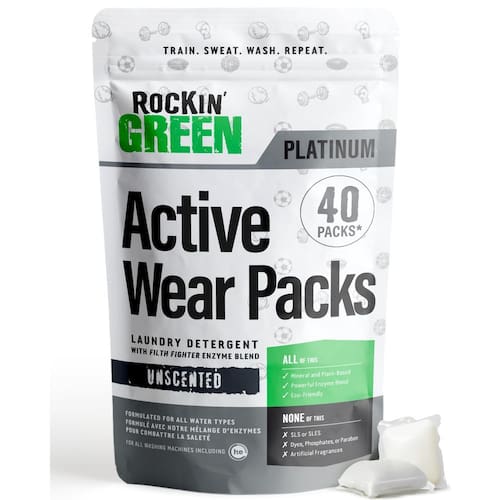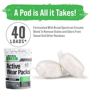 Cápsulas de detergente para roupas ativas Rockin Green, 40 unidades – cápsulas de detergente natural sem fragrância – Elimina manchas e odores difíceis – Detergente ecológico e orgânico para cápsulas de lavanderia