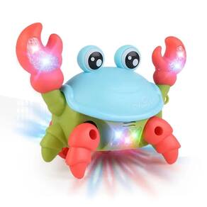 Equipado com luzes coloridas vibrantes e melodias alegres, este brinquedo foi projetado para incentivar o movimento, desafiando a criança a engatinhar ou andar enquanto tenta acompanhar o caranguejo em suas divertidas caminhadas laterais.