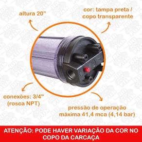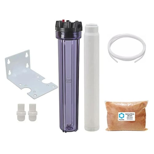 Carcaça de 20 polegadas transparente com resina mista MB475 para estágio extra de osmose reversa. Inclui suporte, conectores e mangueira.Função retrolavagem