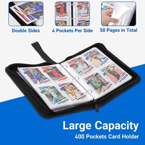 1 -?Tecido premium?O encadernador de cartões é feito de couro PU impermeável e material de veludo macio. Macio ao toque e fácil de limpar. Ótimo como presente para crianças colecionarem seus cartões esportivos -?Compatível com vários cartões?O porta-cartões de 4 bolsos é adequado para colecionar cartas do tamanho de 3,6 polegadas x 2,7 polegadas, como cartas de jogo, cartas de hóquei, cartas colecionáveis, cartas de beisebol, cartas de futebol, cartas esportivas, fotos -?Grande capacidade?O encadernador de cartas colecionáveis Cada folha tem 8 bolsos claramente visíveis (design de armazenamento em frente e verso), um total de 50 folhas, e pode conter 400 cartas. Fornece espaço suficiente para organizar todos os seus cartões -?Pasta de cartões expansível?É recarregável/expansível. O design do fichário facilita a adição ou remoção de folhas -?Perfeito nos detalhes?O porta-cartões colecionáveis tem um zíper liso para evitar que os cartões sejam perdidos. O design extra da pulseira torna o encadernador fácil de transportar