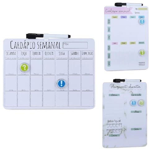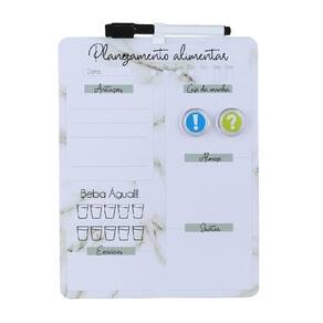 Lousa Magnética Cardápio Semanal – Organização Prática para Suas Refeições Mantenha sua rotina alimentar mais simples e organizada com a Lousa Magnética Cardápio Semanal. Com tamanho ideal e design funcional, ela permite planejar café da manhã, almoço e jantar da semana inteira de forma clara e prática. Benefícios do Produto Organização semanal – planeje todas as refeições da família e economize tempo na cozinha.Versatilidade de uso – pode ser fixada na parede ou em superfícies metálicas como a geladeira.Fácil de limpar – escreva, apague e atualize o cardápio quantas vezes quiser. Design compacto – tamanho ideal para ser visualizado com facilidade (28 × 21,5 cm). Praticidade para o dia a dia – ajuda a manter uma dieta equilibrada e evita esquecimentos. Conteúdo da Embalagem 1 Lousa Magnética Cardápio Semanal 1 Caneta com apagador 2 Ímãs para fixação Acessórios para instalação na paredeTransforme sua rotina de alimentação em algo mais prático e organizado.OBS: Modelo enviado aleatório, não sendo possível escolher Marca: Não Informado