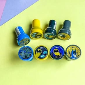o carimbo batman é autotintado e possui reservatório interno de tinta. São 4 estampas com seus personagens favoritos. Composição: resina termoplástica, borracha, corantes e solventes. Inmetro: ocp0098 registro: 001028/2022
