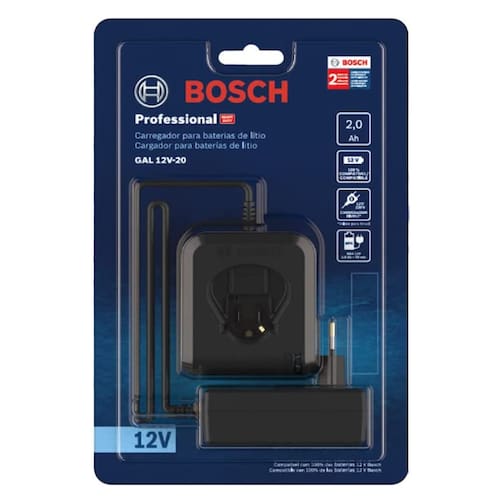 O carregador de bateria Bosch GAL 12V-20, 12V, é BIVOLT e compatível com 100% das baterias 12V Bosch. Tem indicador LED de carregamento; o processo de carregamento é indicado piscando e a luz constante indica que a bateria está totalmente carregada.