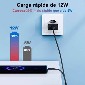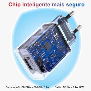 Carregador com duas entradas USB, carga rápida de até 2.4A, entrada bivolt. Fabricado em plástico.Tipo