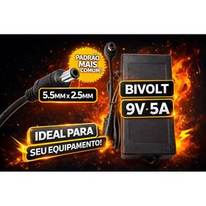Carregador 9V 5A Bivolt Para Câmera LED DVR Fonte Bivolt 9V 5A Plug 5.5mm x 2.5mm Alta Potência Se você precisa de uma fonte estável, potente e segura para seus equipamentos eletrônicos, esta fonte 9V 5A é a solução ideal. Com saída de 9 Volts e corrente de até 5 Amperes, ela oferece alimentação confiável para dispositivos que exigem maior consumo, garantindo desempenho contínuo e seguro. Especificações Técnicas Entrada: AC 100V-240V 50/60Hz Bivolt Automático Saída: 9V DC Corrente: 5A Potência aproximada: 45W Plug DC: 5.5mm x 2.5mm Polaridade: Centro positivo Uso: Ambientes internos Compatibilidade Pode ser utilizada em diversos equipamentos que operem com 9V e plug 5.5mm x 2.5mm, como: Câmeras de segurança CFTV Dvr e NVR Roteadores e modens 9V compatíveis Iluminação LED 9V Mini amplificadores de áudio Teclados musicais Equipamentos eletrônicos e projetos Arduino Impressoras térmicas 9V Equipamentos de automação Placas e módulos eletrônicos Importante: Antes da compra, verifique se o seu equipamento é 9V, utiliza plug 5.5mm x 2.5mm e possui polaridade centro positivo. Principais Benefícios Alta corrente de 5A Bivolt automático 100-240V Estabilidade no fornecimento de energia Ideal para equipamentos que exigem maior potência Plug padrão amplamente utilizado Boa dissipação térmica Proteção contra sobrecarga Serve para aparelhos 9V 3A ou 9V 2A Sim. A fonte fornece até 5A, e o equipamento utilizará apenas a corrente necessária. Pode ser Utilizado em 110V e 220V Sim. É bivolt automático. Serve para qualquer aparelho 9V Desde que seja 9V, utilize plug 5.5mm x 2.5mm e tenha polaridade centro positivo. Marca: Não Informado Ean: 7891086111949