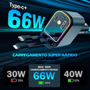 Carregador veicular inteligente de 66W com 2 cabos retráteis (USB-C e Lightning) e 2 portas adicionais (USB-C e USB-A). Carrega até 4 dispositivos simultaneamente. Compatível com veículos 12V e 24V. Possui projetor de luz ambiente integrado, plugue ajustável em 180°, proteção contra sobrecarga e curto-circuito.Tipo