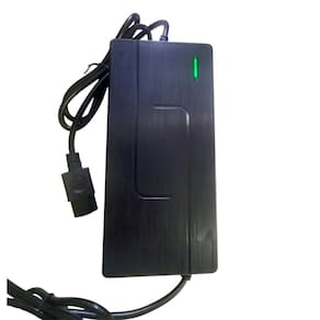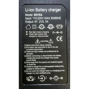 Carregador de bateria de lítio de alta performance. Entrada bivolt automática (110-220v). Saída de 67.2V com 5.0A. Possui luzes indicadoras de status de carregamento (vermelha para carregando, verde para carregado). Inclui cooler para diminuir o aquecimento.Tipo