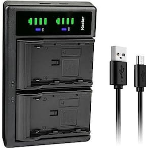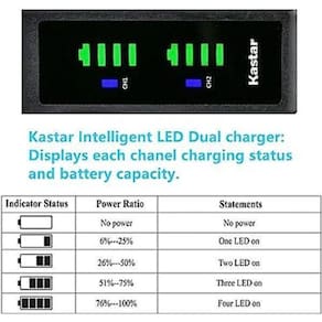 O carregador de bateria duplo digital para canon kastar cb-bp970 possui conexão usb. É inteligente e exibe o status de carregamento e a capacidade da bateria.