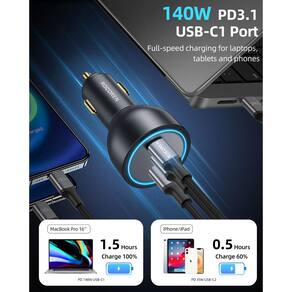 Carregador de carro USB C Rocoren de 165 W, carregador de carro PD3.1 140 W/PD3.0 100 W tipo C, carregador USB de isqueiro de carregamento super rápido QC5 com cabo USB de 240 W para MacBook Pro, iPhone, Samsung, iPad, laptops