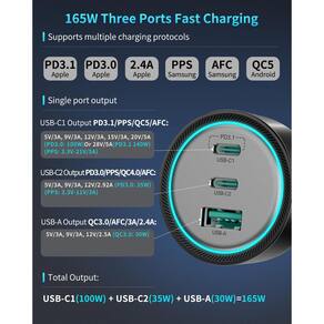 - 🌟?Saída total de 165 W?C1 (100 W) + C2 (35 W) + A (30 W) = 165 W, tecnologia de carregamento rápido independente de 3 portas, a potência de porta única não diminuirá quando usada ao mesmo tempo. Suporta vários protocolos de carregamento, como PD3.1/3.0, QC5/4.0, PPS, AFC, FCP, 2.4A, etc.