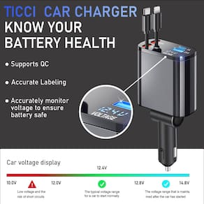 - ?Serviço de qualidade?O carregador rápido retrátil 4 em 1 da TICCI, como um acessório essencial para carro, oferece suporte técnico se você encontrar algum problema durante o uso. Suas perguntas serão resolvidas de forma rápida e eficaz dentro de 24 horas para garantir que sua experiência com nosso produto seja suave e satisfatória
