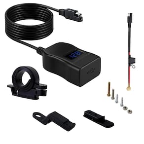 Carregador USB para motocicleta com voltímetro LED, duas portas de carregamento rápido (USB-C PD 30W + QC 3.0 30W), proteção contra sobrecarga, sobreaquecimento e excesso de corrente, botão on/off independente, resistente à água e poeira com tampa protetora emborrachada, fusível de 10A incluso.Tipo
